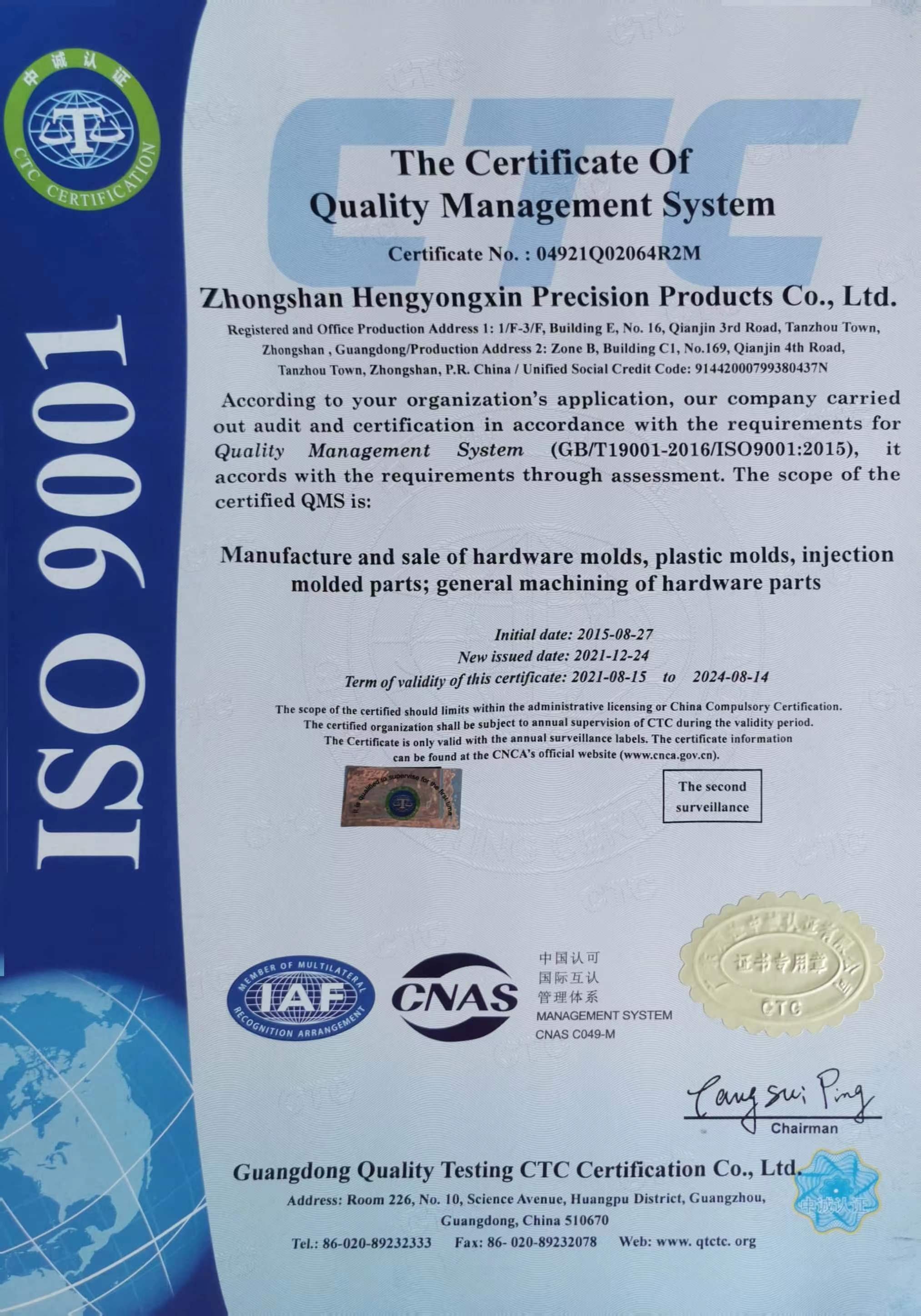 The company is coordinated by the general manager, and the management representative, business department, engineering department, quality control department, production department, material control department and other department heads are responsible for product design and development, raw material procurement, manufacturing, inspection, performance testing, packaging and so on. Database and other links, in accordance with the ISO/IATF16949 system standards for quality management. The company has also established quality system program documents, which clearly define quality objectives and division of responsibilities, ensuring real-time monitoring and continuous improvement of product quality.